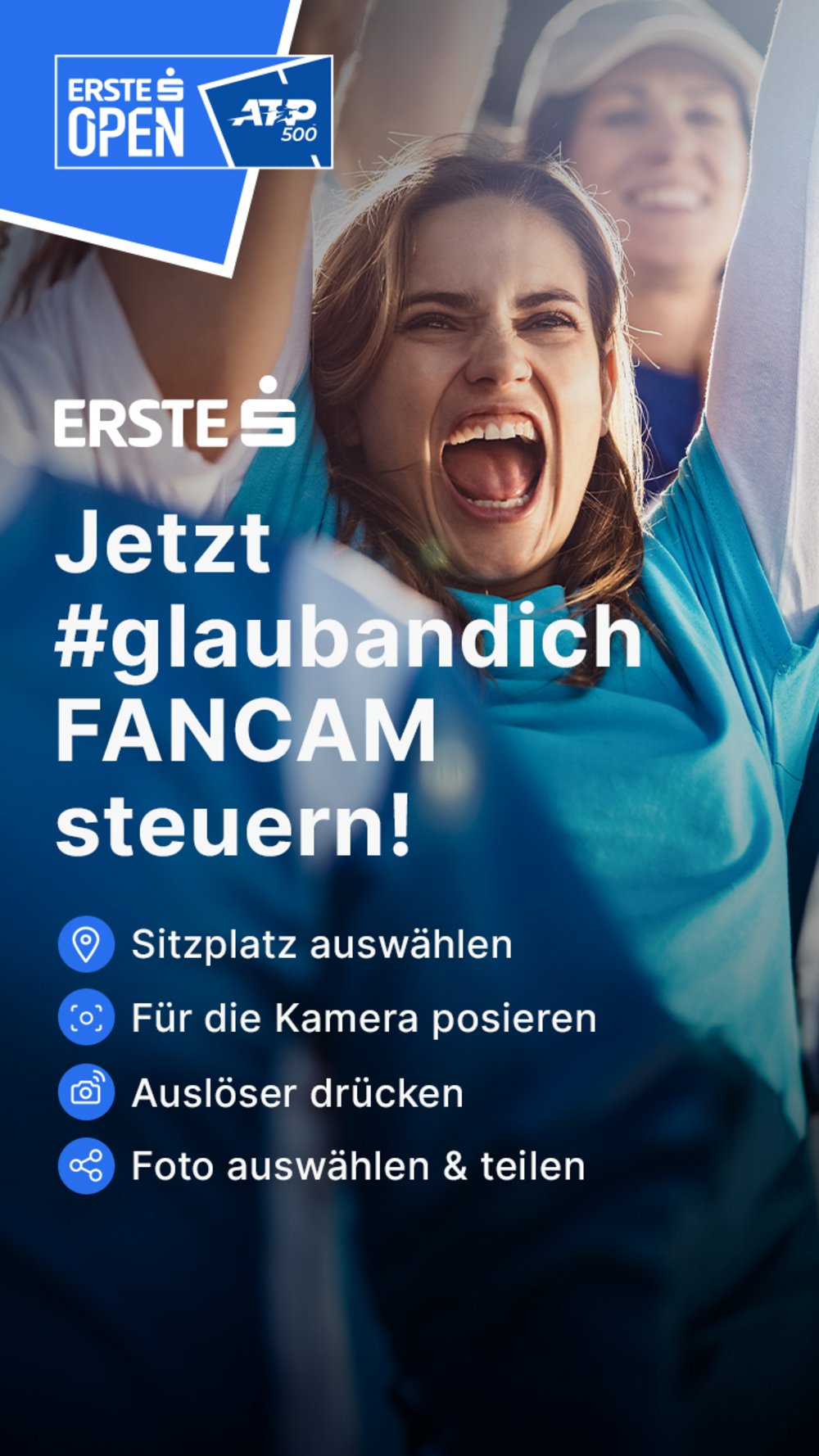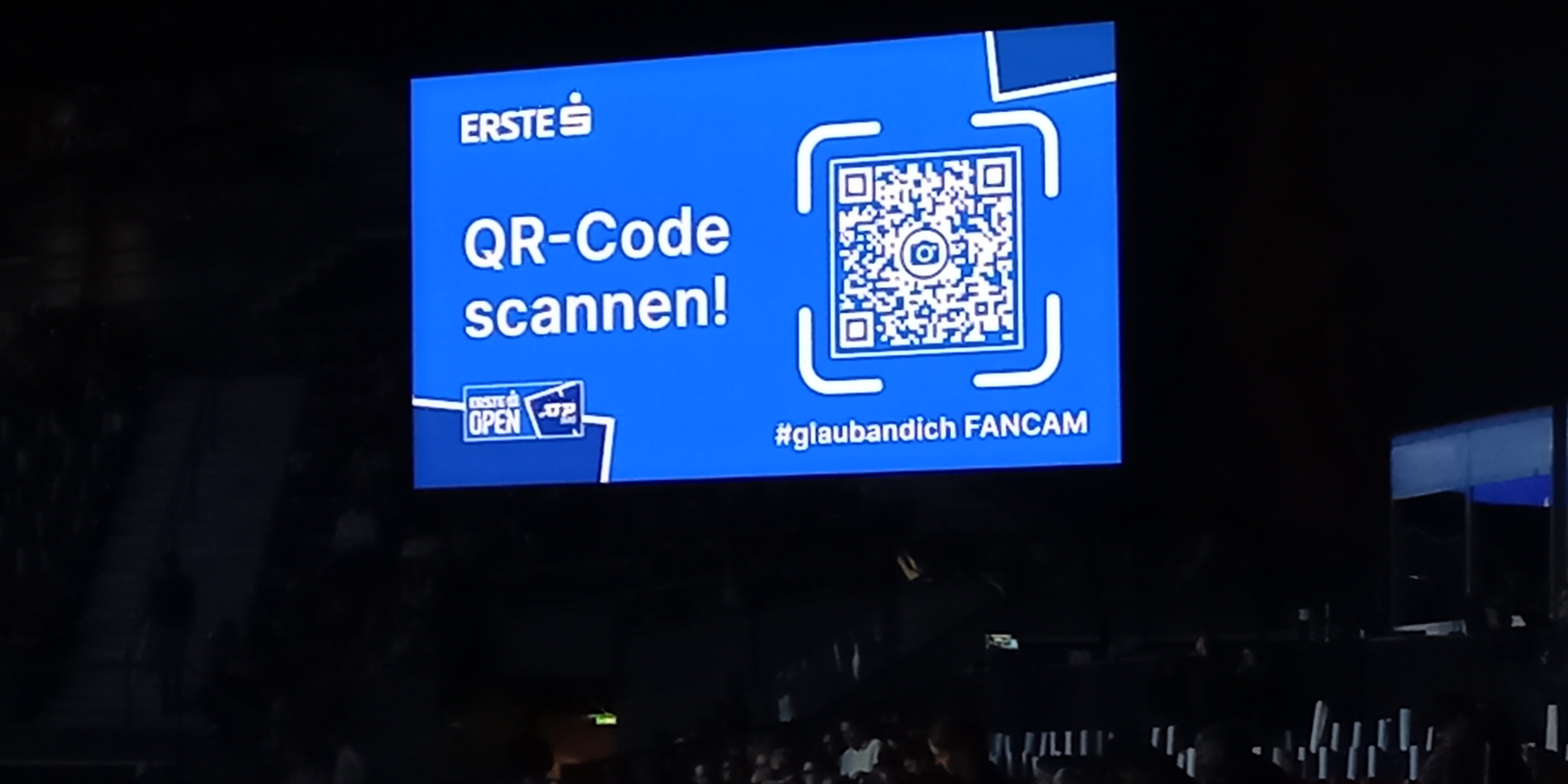 Die Erste Bank macht’s möglich: Die 2024 erstmalig eingesetzte #glaubandich Fancam sorgt bei den Erste Bank Open in Wien auch in diesem Jahr für ein Top-Fanerlebnis. Und so einfach geht’s: Zuschauer:innen in der Stadthalle scannen mit ihrem eigenen Handy einen QR-Code auf https://fancam.erstebank-open.com, geben ihre Sitzplatznummer ein – und eine in der Halle installierte Kamera macht ein Foto von den Fans in den Rängen. Das Bild (mit Erste-Bank-Open- und EBOe-Branding) kann anschließend via Social Media gepostet werden. Probiert es aus!