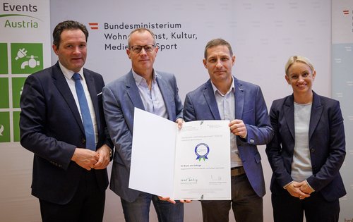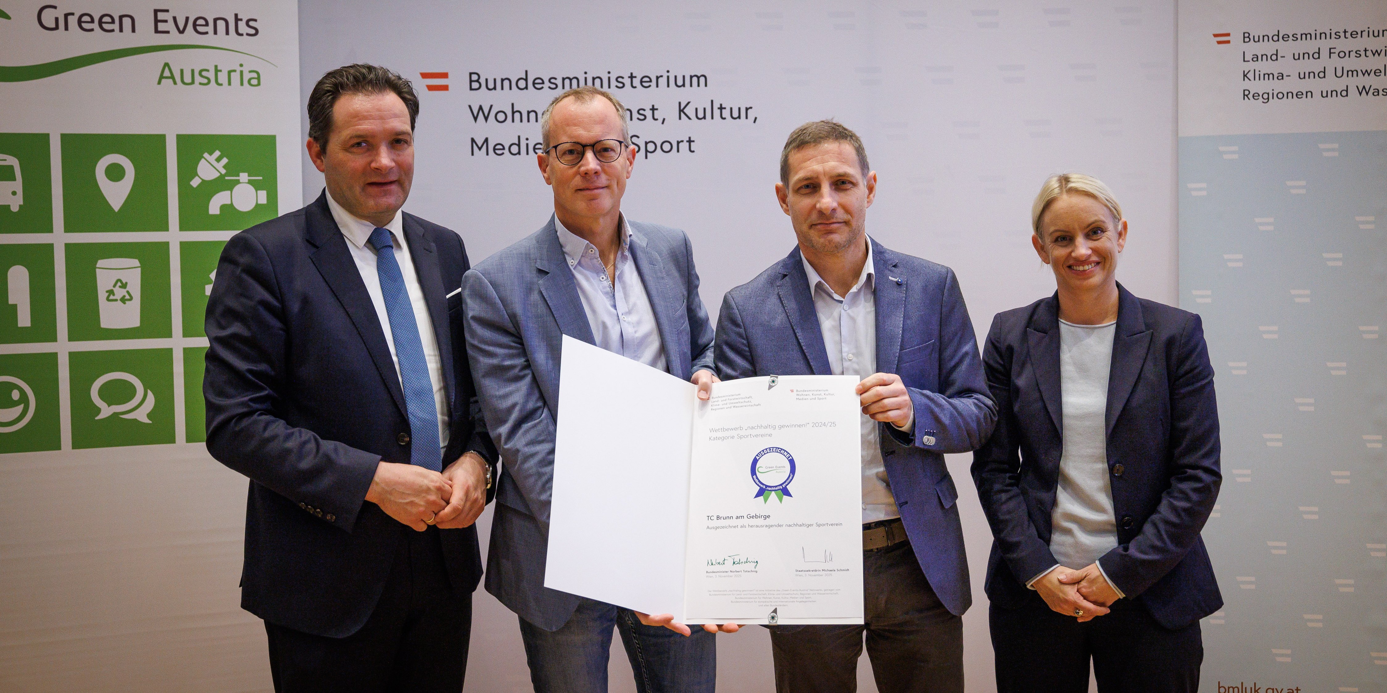 Bei der Auszeichnung in Wien von links nach rechts: Norbert Totschnig (Bundesminister für Land- und Forstwirtschaft, Klima- und Umweltschutz, Regionen und Wasserwirtschaft), Gerald Mitterbäck (Obmann TC Brunn am Gebirge), Peter Pichler (Kassier TC Brunn am Gebirge), Michaela Schmidt (Staatssekretärin im Bundesministerium für Wohnen, Kunst, Kultur, Medien und Sport).